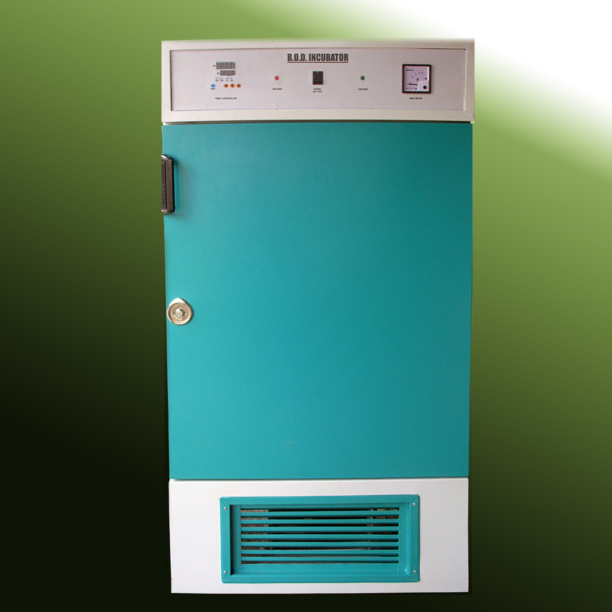 B.O.D. Incubator is the most versatile low temperature indicator for Biochemical Oxygen Demand determination .Castor wheel mounted cabinet is double walled with inner chamber of stainless steel and outer casing of M.S. sheet duly painted. The gap of 75 mm between the outer and the inner wall is filled with special grade glass wool to prevent thermal losses. Tripple walled back of the unit is fitted with two air circulation fans for maintaining the temperature uni formally throughout the chamber. Heating elements of nicrome wire are placed in the air path and are duly insulated from the body. The inner chamber is ribbed for placement of shelves at desired heights. full view inner glass door permites inspection of specimens, without disturbing the same. Lock and key arrangement is provided in the double walled outer door. Unit is fitted with door operated illumination lamp inside the chamber. The temperature range from 5 °C to 50 °C is controlled by Digital Temperature Controller cum Indicator. Refrigeration unit is formed by hermetically sealed ISI marked SHRIRAM make compressor and the cooling coil are distributed all round the chamber and lie in the air circulation path. Panel consist of seperate indicator lamps for mains, heating and incoming voltage. Supplied complete with 2/3 shelves, cord and plug to work on 220/230V A.C. supply.